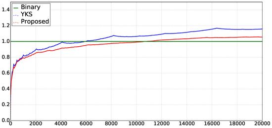 In Figure 2, the vertical axis shows the ratio (the average size of cumulative sum of extended -terms from 1 to n). That is, Figure 2 shows how and increase compared to on average. As can be seen, tends to be greater than when n is greater than 10,000. We consider that it is consistent with the theoretical upper bound , stated in Theorem 4.