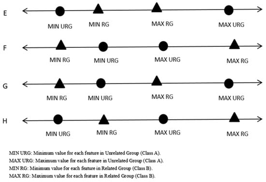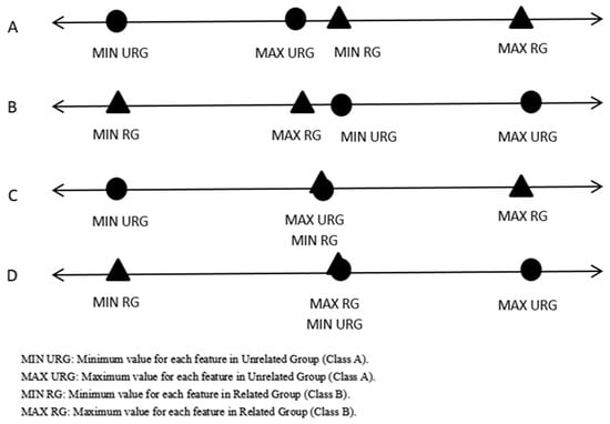 Step 1: Find the maximum value, minimum value, and computed arithmetic mean for each feature for each class. Following this, check for any possible overlaps between the maximum values and minimum values for each feature in the first class with the corresponding feature in the second class. It is necessary to exclude possible overlaps (ideal cases, as can be noticed in Figure 2) before generating meaningful virtual samples.