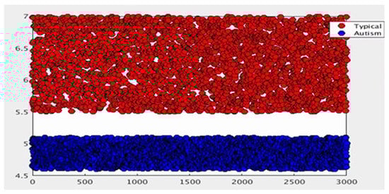 The first dataset was collected at Scientific Institute IRCCS Eugenio Medea in Italy (Bosisio Parini, Italy). The dataset included data from 30 participants divided into two groups: 15 children with a clinical diagnosis of Autism Spectrum Disorder (ASD) (“ASD is a neurodevelopmental disorder characterised by persistent social impairment, communication abnormalities, and restricted and repetitive behaviours (DSM-5) (1, 2). ASD is a complex condition with an average prevalence of about 1% worldwide.”) and 15 participants with typical development. For each participant, 17 kinematic parameters (numerical features) related to an upper-limb movement were registered []. In the original work, a feature selection algorithm was used to identify the seven features that best differentiated participants with ASD from healthy controls. In the present work, our algorithm randomly selected six participants (from now on, samples) as an original small dataset, with three samples for each group (ASD and healthy children), and the remaining 24 samples were used as the testing dataset. For comparison, we generated 10,000 virtual samples using the proposed method for every collection in the first trial, and then, this rose by the following numbers each time: 25,000, 50,000, 100,000, 200,000, and 300,000. The identical learning procedure was repeated for five rounds.
