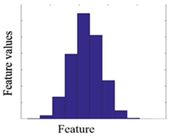 In the second process, Equation (7) generated new virtual samples depending on the maximum, minimum, mean, and standard deviation computed for every collection of all discriminative features and added them to the corresponding group of the original dataset Equations (3) and (4). A MATLAB function [] was used to generate a virtual sample in a normal distribution. The distribution of the virtual sample is illustrated in Figure 6.