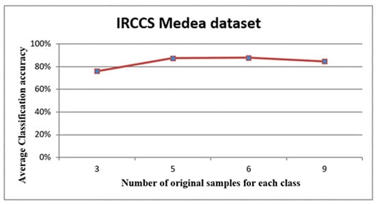 The graph in Figure 7 depicts the relationship between the number of original samples for each class that was used to generate the virtual sample and the average of classification accuracy. The graph showed a growth in the relationship between six samples, followed by a levelling out. Overall, from this graph, it is possible to conclude that the number of original samples was not critical for generating the virtual sample. Moreover, this demonstrated that the proposed method was efficient with only a small number of original samples.