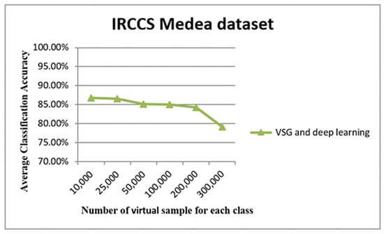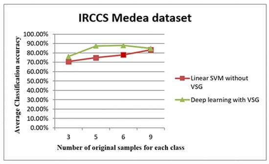 The trend of average accuracy using the IRCCS dataset. The line graph in Figure 8 shows the comparison between the performance of linear SVM without Virtual Sample Generation (VSG) and deep learning with the VSG number in the IRCCS Medea dataset. The x-axis of this graph shows the original samples for each class that were used to generate the virtual sample in deep learning and the training sample for linear SVM, while the average of the classification accuracy is the y-axis.