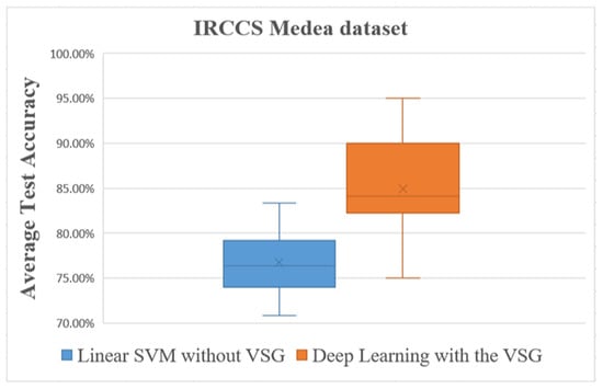 The box plot in Figure 9 shows distinctly that the present deep learning method with the proposed method exceeded in overall comparisons the linear SVM method using the IRCCS Medea dataset.