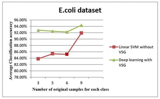 The line graph in Figure 10 shows the comparison between the performance of linear SVM without VSG and deep learning with VSG number in the E. coli dataset. The experiment of our method performed on the E. coli dataset replicated the trend of findings for the IRCCS Medea dataset. Indeed, it was clear that deep learning with the proposed method outperformed the linear SVM method without VSG for the first of all intervals considered.
