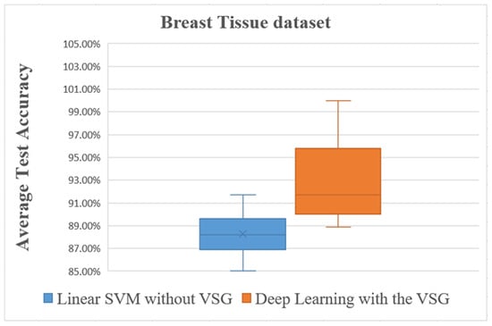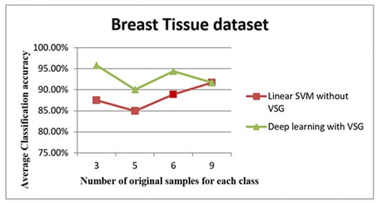 The line graph in Figure 12 shows the comparison between the performance of linear SVM without VSG and deep learning with VSG in the Breast Tissue dataset. The experiment of our method performed on the Breast Tissue dataset replicated the trend of the findings for the IRCCS Medea dataset and the E. coli dataset. Indeed, it is clear that deep learning with the proposed method outperformed the linear SVM method without VSG for the first three intervals considered.