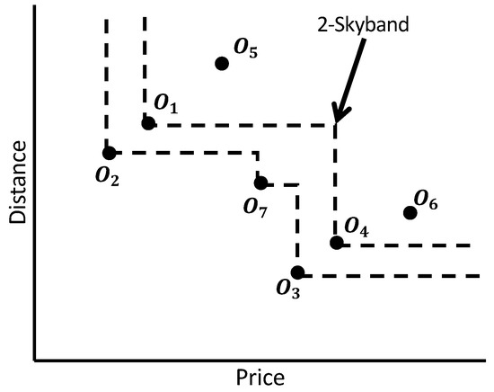 Figure 7 presents the skyband and dominating objects computation process. To compute K-skyband, if we set , the query returns , , , , as the two-skyband objects set, since the score values for these objects is less than 2. Then, our method outputs objects and as the top-2 dominating result because both objects have the highest score value.