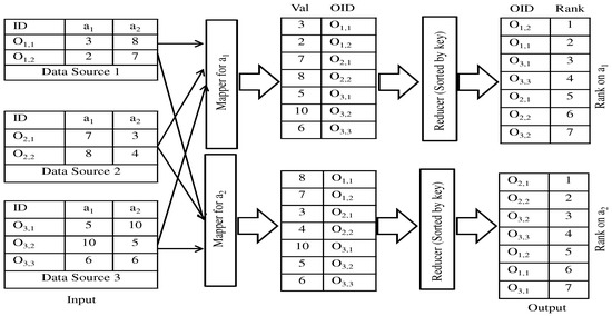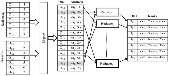 P2: Shuffling. In this phase, each map worker outputs (, ) pairs, where is the attribute name with the corresponding attribute rank for each object in the attribute domain. Next, each “reduce” worker also produced (, ) pairs for each object, where is a list of attribute names and the respective rank value for each attribute.