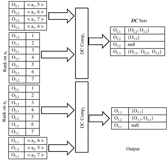 Theorem 1 demonstrates that it is sufficient to perform a domination check between an object O and the corresponding set to determine whether or not O is in the query results. To analyze this result, recall object and its corresponding set . Because has the worst rank of 5 for attribute , this means that this object has no possibility to dominate a higher rank object, such as , or . This means we need to perform a domination check only between and its set .