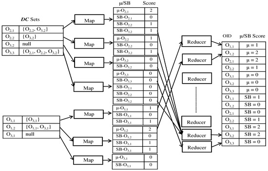 After performing a domination check, each map worker produces two types of keys: the score for the corresponding object and the score for all objects. If an object dominates another object in the set, the score value of the corresponding object and score value of the dominated objects are incremented by 1. Next, all of the scores and scores are sent to the reduce workers. After applying a “group-by” operation, the reduce workers can provide K-skyband and top-k dominating query results.