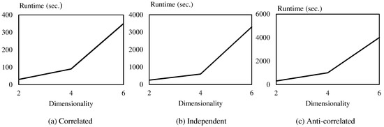 To study the effect of dataset dimensionality, we used datasets with the cardinality of 100K, skyband size of , and dimensionality m ranging from 2 to 6. The runtime results for this experiment are presented in Figure 8a–c. The results reveal that as dimensionality increases, the performance of the proposed method gradually decreases. This degradation in performance was caused by growth in the number of non-dominant objects in high dimensions. It should be noted that the data distribution factor also influences algorithm performance. As the number of non-dominant objects in the correlated dataset is fewer than that in the anti-correlated and independent datasets, the algorithm with the correlated data generally requires less execution time than those with the other data distributions. Execution on the correlated dataset is 10 times faster than on the independent dataset and 12 times faster than on the anti-correlated dataset.