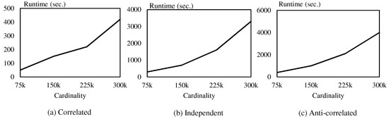 We similarly examined the efficiency of the proposed method with different cardinalities. The results for varying cardinality are presented in Figure 9. For this particular test, we used a dimensionality m of 6, skyband size of , and datasets cardinality ranging from 75,000 to 300,000. Figure 9a–c present the results for the correlated, independent, and anti-correlated datasets, respectively. The proposed technique had the fastest runtime for all three data distributions when the cardinality is low. However, as the data cardinality increases, the performance of the proposed method consistently decreases. As expected for anti-correlated data, the proposed method fails to dominate a reasonable number of objects, and the performance is worse than that for correlated and independent data.