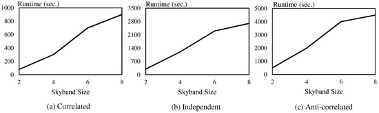 We also examined the efficiency of the proposed technique with various skyband sizes. For this evaluation, we used a data dimensionality m of 6, data cardinality of 100,000, and skyband size K ranging from 2 to 8. Figure 10a–c present the runtime for the different distributions. As indicated by the results, our method was affected by the skyband size. Our experimental results show that the runtime increases dramatically as the skyband size increases. The large cardinality of non-dominating objects causes this.