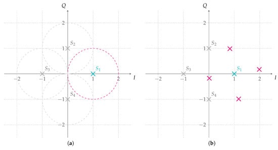 Figure 4 shows the possible received symbol i after phase compensation with no noise when symbol (or ) is transmitted. The received symbol can lay anywhere on the red circle if no assumption on interference relative phase shift is done; see Figure 4a. If a relative shift of is present, then any of the four red points can be received depending on the transmitted interference symbol k; see Figure 4b.