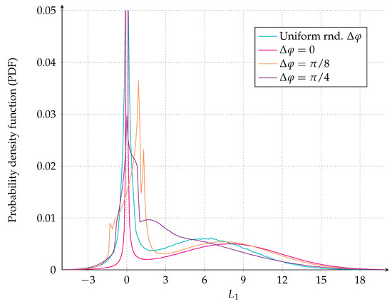 In Figure 5, the probability density function (PDF) of the bit LLRs assuming a symbol-synchronous QPSK interferer either uniform at random phase or with a fixed relative phase offset plus AWGN noise with dB is shown. For the plot, we assume that either symbol or has been transmitted, i.e., Bit level 1 is zero. The curve with shows the PDF of the bit LLRs for the case of the aligned phase. The channel LLRs are no-longer Gaussian, and thus quantized density evolution, which passes the entire LLR though the decoding algorithm, rather than a Gaussian model, will be used to calculate the code thresholds.