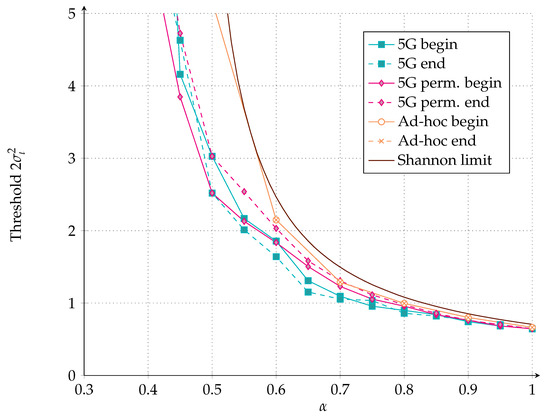Fix , , , , where the first column is punctured. For the multi-target optimization, we impose the symmetry constraint in (6). For complexity reasons, we optimize the threshold for only two different values of α, namely and . The differential evolution algorithm in [39] was executed with the following parameters: crossover probability of , population size of 200, and number of generations of 4000. The multi-target optimization yields: