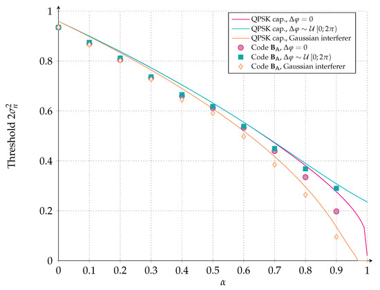 The Gaussian interference model yields channel LLRs for the two QPSK bit levels that are Gaussian distributed. For this setup, EXIT analysis [40] is known to provide accurate iterative decoding threshold estimates. Thus, for each , we aim at determining the maximum amount of interference , such that error-free decoding is possible. Following the results in [40], this requires that the log-likelihood a posteriori probability (APP) mutual information (assuming that the block length and the number of decoding iterations go to infinity).