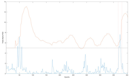 After 3 min from the beginning of a record, the adaptive threshold is adjusted for each epoch. In Equation (4), the weight of the first PBI block is two times higher than the second and third, as the average of the first PBI block carries more information about the background activity of the brain. The second and third blocks are equally important for capturing activity during transition, hence they are weighted equally.