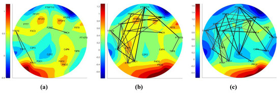 The connection ratio is evaluated after sensing an abnormality activity using the PBI method. To determine a transition from a preictal to ictal period, the DN is studied in the high gamma band. An example of this increase in the connection ratio during transition from preictal to ictal is shown in Figure 3. Figure 3a shows the DN at an epoch before a seizure start, and Figure 3b,c shows the increase in connections as the seizure progresses. The connection ratio in a region should be greater than 0.2 in order to declare a focal seizure in a region. A generalized seizure covers more than a focal seizure. Note that we only compute the connection ratio if the PBI measure indicates the possibility of a seizure. The background color of the DN schematic, displayed in Figure 3a–c, shows the relative power of the channels, with darker red regions indicating higher brain activity.