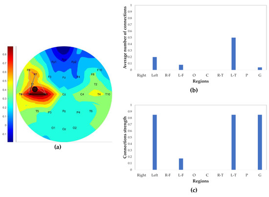 Correlation within the network (CN) example at the beginning of a seizure; (a) CN contains connection, marked target of the seizure origin, and colored-background by the normalized power of the channels; (b) average number of connections in each region (right, left, right-frontal (R-F), left-frontal (L-F), occipital, central, right-temporal (R-T), left-temporal (L-T), parietal, general); and (c) strength of connection in each region.