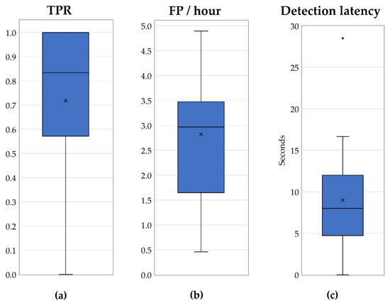 Temporal performance of the proposed algorithm: (a) TPR, (b) FP/hour, and (c) detection latency.
