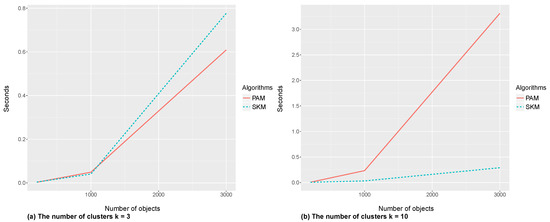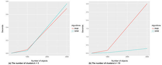 The comparison took two different numbers of clusters () in small and large numbers of objects (). Each evaluation was averaged over 50 replications with seconds as the evaluation unit. The comparison also applied two different random number generators (). Figure 3 and Figure 4 show that PAM had a faster run time than SKM when the number of clusters was small () and the number of objects was large (). With large k and n (), on the other hand, SKM required less time compared to PAM. Thus, SKM and PAM were on par for small n and k.