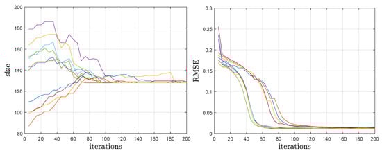 Evolution of the dictionary size (left) and of the RMSE (right) during 10 runs of ITC-ADL, with , .