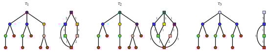 In all the sequel, we consider unordered rooted trees for which the order among the sibling vertices of any vertex is not significant. A precise characterization is obtained from the additional definition of isomorphic trees. Let and two rooted trees. A one-to-one correspondence is called a tree isomorphism if, for any edge , . Structures and are called isomorphic trees whenever there exists a tree isomorphism between them. One can determine if two n-vertex trees are isomorphic in [] (Example 3.2 and Theorem 3.3). The existence of a tree isomorphism defines an equivalence relation on the set of rooted trees. The class of unordered rooted trees is the set of equivalence classes for this relation, i.e., the quotient set of rooted trees by the existence of a tree isomorphism.