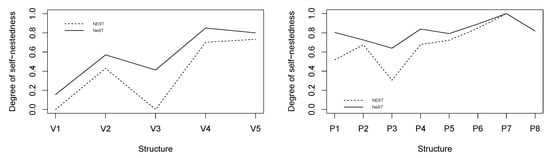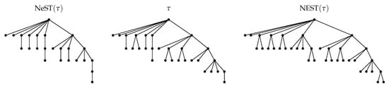 where stands for Zhang’s edit distance []. In [] (Equation (6)), the degree of self-nestedness of a plant is defined as in (7) but normalizing by the number of nodes of the NEST and not the size of the initial data, which avoids the indicator to be negative. In the present paper, we prefer normalizing by the number of nodes of to obtain the following comparable self-nestedness measure based on the calculation of ,