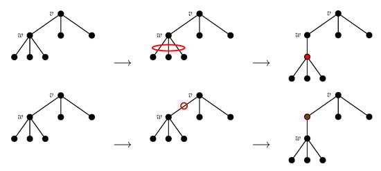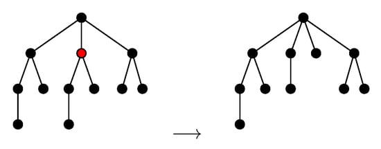 We shall define the NEST and the NeST of a tree . As in [] (Equation (5)), we ask these approximations to be consistent with Zhang’s edit distance between unordered trees [] denoted in this paper. Thus, as in [] (2.2 Editing Operations), we consider the following two types of editing operations: adding a node and deleting a node. Deleting a node w means making the children of w become the children of the parent v of w and then removing w (see Figure 3). Adding w as a child of v will make w the parent of a subset of the current children of v (see Figure 4).