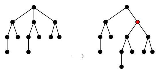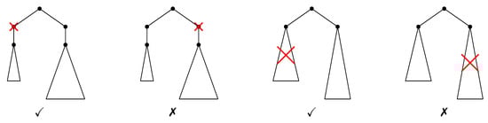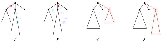 A particular case of Lemma 4 is the insertion of leaves in a tree. Considering the above result, a leaf can be added under v if and only if , i.e., v is not a leaf. The below results concern deleting operations that preserve the height of the remaining nodes of .