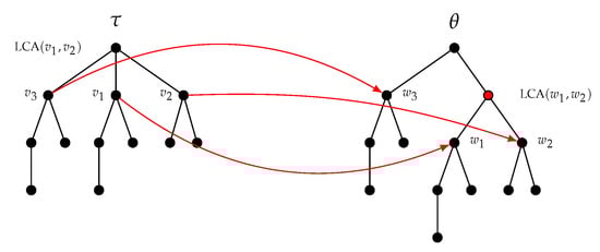 The tree is obtained from by inserting an internal node. The associated mapping does not satisfy the conditions imposed by Zhang [] because the LCA (Least Common Ancestor) of and is a proper ancestor of whereas the LCA of and is not a proper ancestor of .