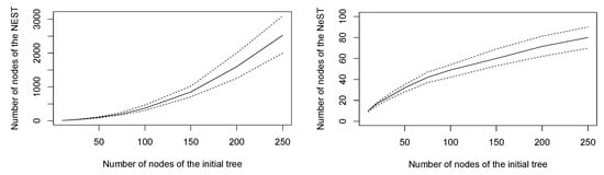 The aim of this section is to illustrate the behavior of the NEST and of the NeST on a set of simulated random trees regarding both the quality of the approximation and the computation time. We have simulated 3000 random trees of size 10, 20, 30, 40, 50, 75, 100, 150, 200, and 250. For each tree, we have calculated the NEST and the NeST. The number of nodes of these approximations is displayed in Figure 9. We can observe that the number of nodes of the NEST is very large in regards with the size of the initial tree: approximately one thousand nodes on average for a tree of 150 nodes, which is to say an approximation error of 750 vertices. Remarkably, the NEST has never been a better approximation than the NeST on the set of simulated trees.
