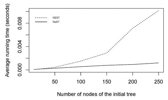 The computation time required to compute the NEST or the NeST of one tree on a 2.8 GHz Intel Core i7 has also been estimated on the set of simulated trees and is presented in Figure 10. As predicted by the theoretical complexities given in Propositions 6 and 7, the NeST algorithm requires less computation time than the NEST. Consequently, the NeST provides a much better and faster approximation of the initial data than the NEST.