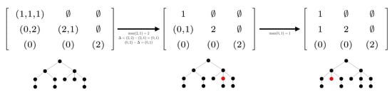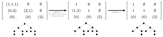 To this end, we have introduced the notion of height profile of a tree. Roughly speaking, the height profile is a triangular array which component , with , is the list of the numbers of direct subtrees of height in subtrees of height , where a subtree is said direct if it is attached to the root. We have shown in Proposition 3 that self-nested trees are characterized by their height profile. While the first NEST algorithm [] was based on edition of the DAG related to the tree to be compressed, the two approximation algorithms developed in the present paper take as input the height profile of any tree , which can be computed in -time (see Proposition 2), and modify it from top to bottom and from right to left, to return the self-nested height profile of the expected estimate (see Algorithms 2 and 3). Figure 13 and Figure 14 illustrate the progress of the algorithms on a simple example. They should be examined in relation to the corresponding algorithms. We would like to emphasize that our paper also states the uniqueness of the NEST and of the NeST, and studies the link with edit operations admitted in Zhang’s distance.