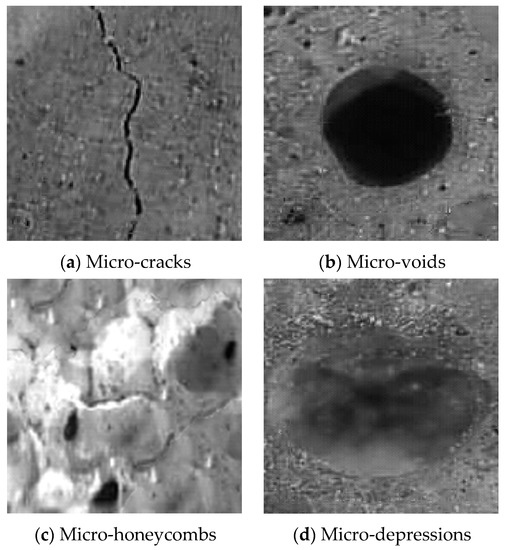 Micro-damage image. (a) Micro-honeycombs; (b) Micro-voids; (c) Micro-cracks; (d) Micro-depressions.