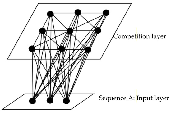 The self-organizing map neural network (SOM); strengthening central neurons and inhibiting peripheral neurons is a unique property of biological neuronal systems. The patterns of competition between neurons is a mechanism formed by the brain’s self-organization [37]. SOM retains the spatial topology of input neurons due to its unique neighborhood characteristics and obtains the best mapping by continuously adjusting the connection weights of winning neurons and neighboring neuron network nodes [38]. The SOM neural network closely combines the phenomenon of enhancing the center and suppressing the surrounding of the biological neuron system with the self-organization characteristics of the human brain. Therefore, SOM retains the topology of the network and can be based on limited sample space failure detection, effectively reducing the need for spatial samples in the intelligent diagnostic system. Figure 2 shows a typical self-organizing feature mapping network model consisting of an input layer and a contention layer. The input layer contains n neurons, and the competition layer is a two-dimensional planar array composed of m × n neurons [39]. This section utilizes SOM to identify micro-damage structures.