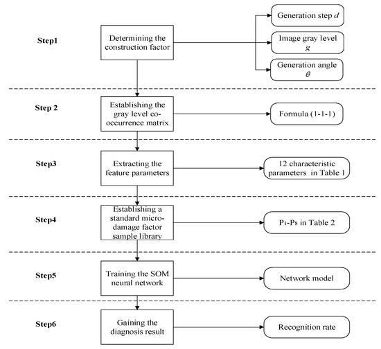 A diagnosis model based on SOM and GLCM was established in order to obtain the results of the micro-damage recognition of underwater structures. The diagnosis steps are shown in Figure 3.