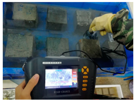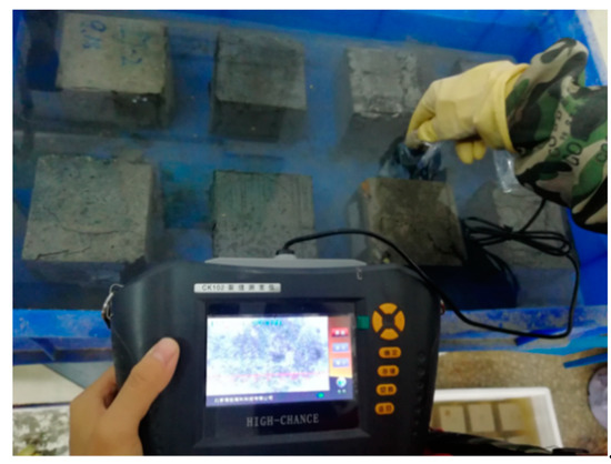 An underwater micro-damage visual diagnosis system was established according to the characteristics of underwater structures, as shown in Figure 4. The system mainly contains a HCCK-102 series crack detection system (including industrial camera, industrial endoscope, control interface), maintenance pool, concrete test block, computer etc. Among them, the industrial endoscope has a magnification of 40x and a measurement accuracy of 0 to 0.08 mm. The micro-damage image of the underwater concrete test block was obtained based on the diagnosis system. The image definition was extremely reduced due to the turbid water quality, insufficient light, and the configuration of the protective cover for the micro-probe. Underwater micro-damage images were processed by ROI (region of interesting) interception, histogram equalization, and a median filter.