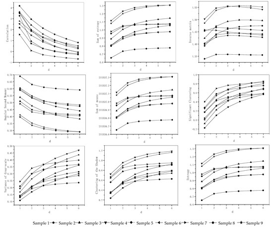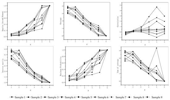 Figure 8 is the variation of g of six characteristic parameters, including angular second-order moment, entropy maximum probability, etc. It can be analyzed that when g = 5, each characteristic parameter exhibits high discreteness and high stability.