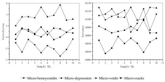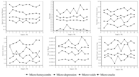 In order to quantitatively describe the direction, trend, and complexity of different micro-damage types in gray space, the gray-scale co-occurrence matrix was applied for feature extraction [30]. Table 1 shows the calculation formula and texture characteristic of the parameters.