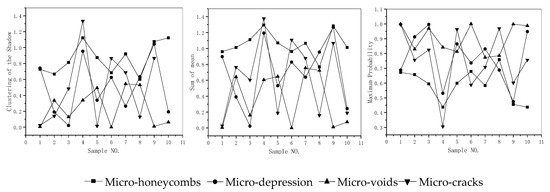 It can be derived that when d > 4, the characteristic parameter changes tend to be stable basically; when d = 5, the samples of each group can be better distinguished; when d = 6, there is a clear downward trend in aggregation in the correlation, the significant clustering, and the clustering shadow characteristic parameters.
