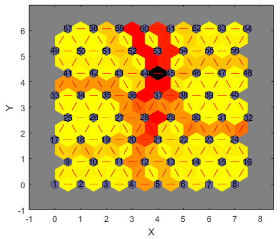 To verify the reliability of parameter optimization, the topological structure of the winning neurons in Figure 12 was analyzed. The gray hexagon with the number in the figure corresponds to the classification label of the winning neurons.