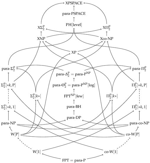 An overview of parameterized complexity classes up to the second level of the Polynomial Hierarchy, and higher. Dashed lines indicate a hierarchy of classes—e.g., between and lies the hierarchy .
