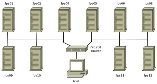 Beowulf cluster used in the experiments. Lines between devices may represent multiple Ethernet cables for diagram cleanliness purposes. Cluster nodes are prefixed with “lps”. Detailed cluster configuration is informed in the Appendix A.