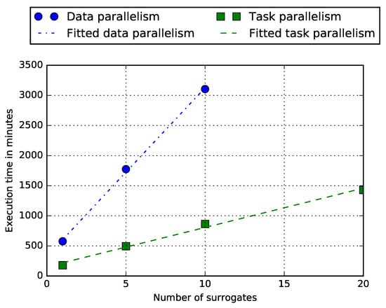 Execution logs gave the total execution time per number of surrogates as shown in Figure 4 by the point marks, and the presented dashed lines are fitted by the linear least square method. Line slopes for each parallelism strategy are 280.385 min/surrogate (Data Parallelism) and 65.257 min/surrogate (Task Parallelism). Therefore, the quickening can be determined as