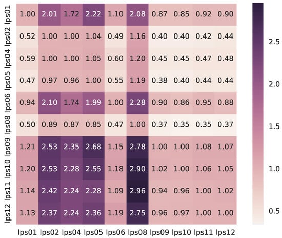 DTE Task Parallelism performance comparison between different computing nodes to highlight cluster heterogeneity. In Task Parallelism, each experiment spawned DTE tasks of the same size across computing nodes, their execution times were used to calculate quickening of the y-axis computing node over the x-axis computing node and finally an average of calculated speedups for each cell was made. An execution log used to generate this plot was from 20 surrogates. Values are given in relative quickening.