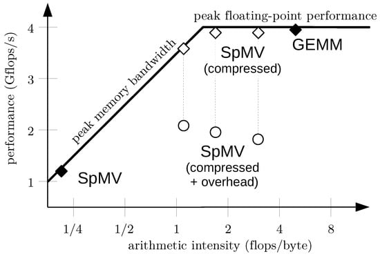 Figure 1. Sparse matrix-vector products are usually memory bound with an arithmetic intensity of less than 0.25 flops/byte. Data compression increases the arithmetic intensity and moves the computation towards the peak floating point roofline. For illustration, compression factors between 4 and 16 are shown, representing different compression schemes. The (de)compression overhead of one to three flops per payload flop reduces the performance delivered to the original computation. Depending on the complexity of the compression scheme, and hence its computational overhead, the resulting performance can even be worse than before. This implies that to overcome the memory wall, only very fast, and therefore rather simple, compression schemes are beneficial.