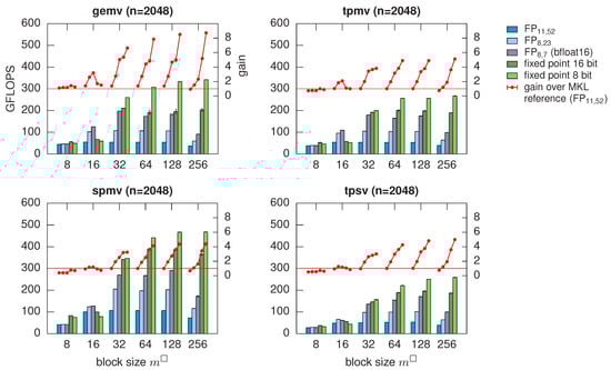 While compression can reduce the memory traffic such that the algorithm becomes compute-bound, the overhead of compression and decompression realized in the software reduces the budget available for payload flops. This is illustrated in