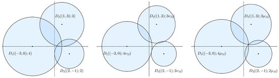It follows that every -rescaled triplet has a nonempty intersection. Therefore, the -rescaled 2-disk system  also has the nonempty intersection property. Moreover,  for every triplet . Therefore,  is actually the Čech scale of the 2-disk system M, this is, .