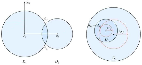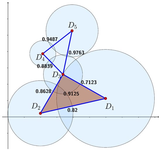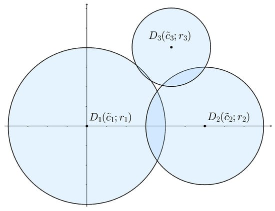 Thus, the problem of determining whether  is empty or not, can be treated as one in the plane, constructing a disk system in  that preserves the affine configuration of the points  in the affine space . To do this, we set the first center  as the origin in , and “translate” the others centers preserving their original configuration, taking care of moving the second center on the x-axis, as in Figure 9.